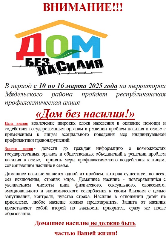 В период с 10 по 16 марта 2025 года на территории Мядельского района пройдет республиканская профилактическая акция «Дом без насилия!»