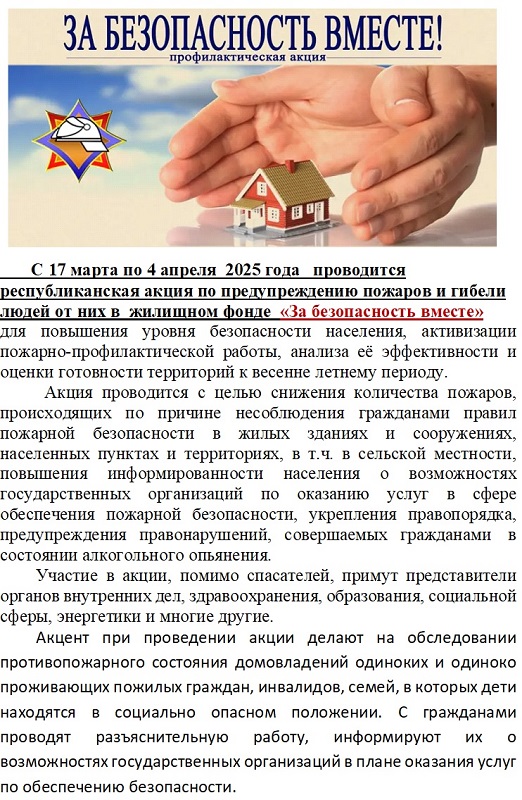 С 17 марта по 4 апреля 2025 года проводится республиканская акция по предупреждению пожаров и гибели людей от них в жилищном фонде «За безопасность вместе»
